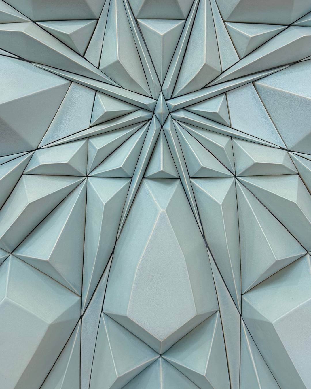 La serie de relieves geométricos de Juan Parada también busca cuestionar límites de orden técnico y material. Su metodología de producción reconcilia procesos arcaicos con los propios de la tecnología actual. En sus piezas conviven un material y una técnica antiguas con un diseño conseguido mediante el uso de software digital. Con apoyo de esta tecnología, Parada consigue dibujos vectoriales que son utilizados para crear una especie de retícula que guía la conformación de sus relieves. Su volumen, en cambio, es interpretado por el artista y ejecutado de forma manual. Aunque los relieves geométricos cuenten con un acabado de apariencia industrial, o de impresión 3D, como si fueran de plástico o metal, cada uno de sus componentes o elementos fue producido por el artista, mostrando una maestría en la precisión del modelado – resultado de una práctica manual que ha desarrollado desde la infancia. Este borramiento del gesto en la producción de cada módulo, altera la percepción de su materialidad y demanda cierta atención del espectador. Del mismo modo, apunta a la definición que Parada da a cierta parte de su producción como anti-cerámica a partir de la forma que elimina tanto el gesto como cierta búsqueda pictórica relacionada con el uso de esmaltes.