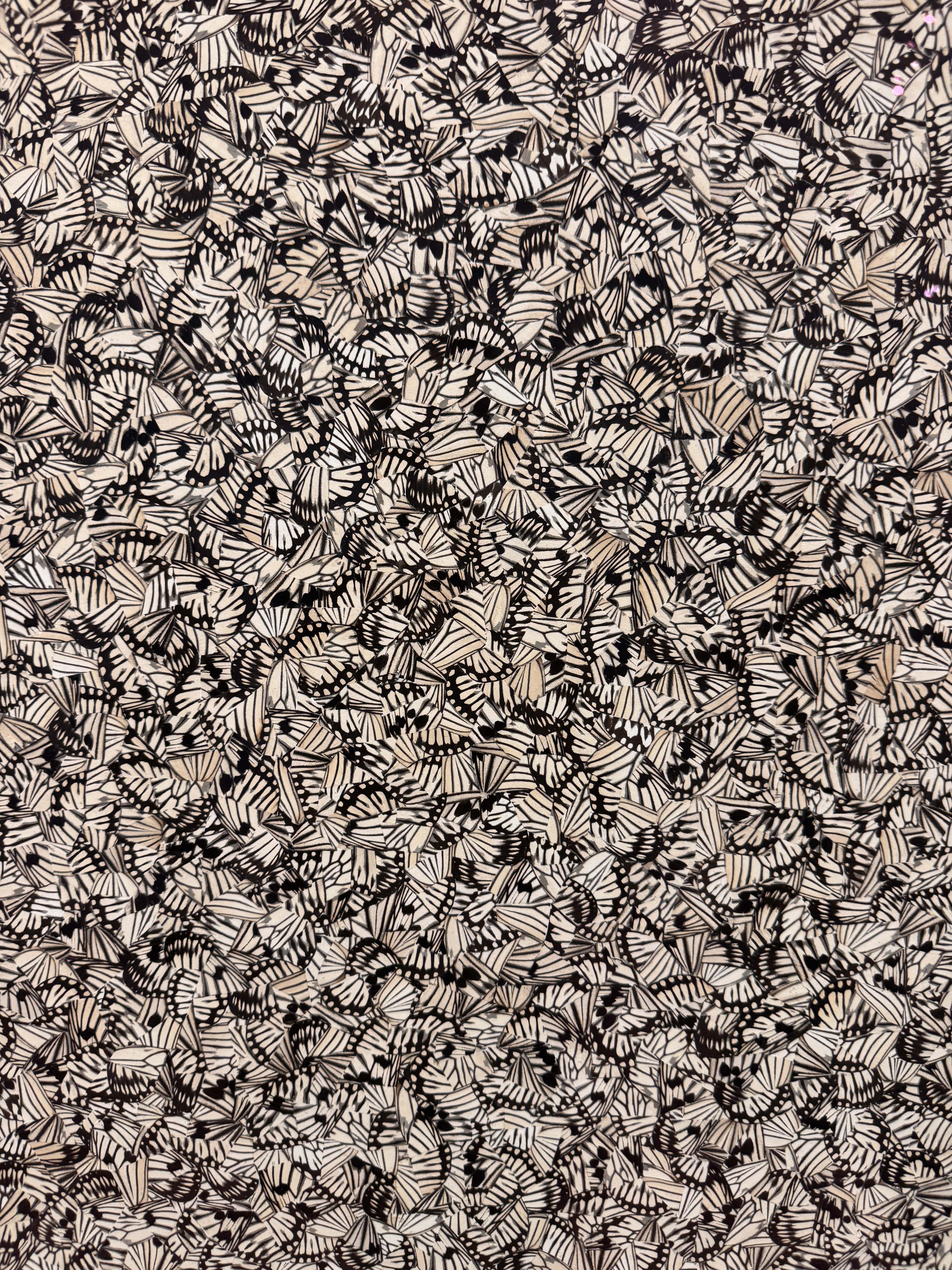 Gabriel de la Mora: La Petite Mort is a thematic survey of the artist’s practice over the past 20 years. Gabriel de la Mora (Mexico City, 1968) is known for his transformation of materials through seemingly alchemic processes to create exquisite objects and alluring surfaces. Those processes can be highly crafted, such as the careful dissection and mounting of butterfly wings or human hair set into geometric compositions, or the painstaking reclamation of historic, weathered ceilings onto canvas. They may equally be the result of elemental forces of fire or water, that react with and erode paintings, prints and papers to the edge of degradation.